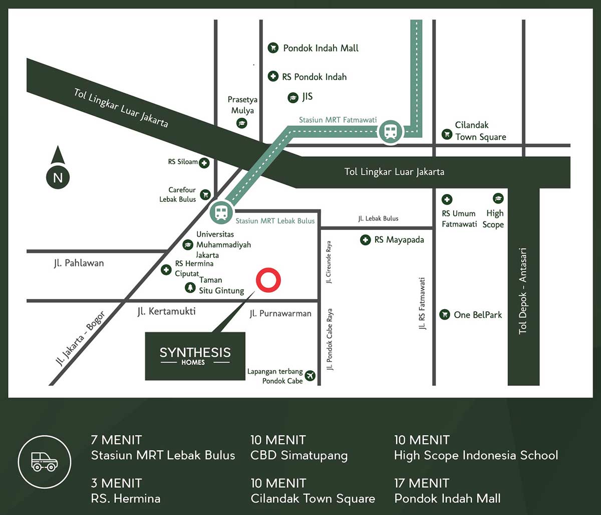 Proyek hunian terbaru karya Synthesis Development yang dikembangkan di area Ciputat, Tangerang Selatan. Synthesis Homes dengan luas area 4,7 hektar terdiri dari 3 tipe rumah dengan jumlah total 267 unit dengan mengusung fitur Smart Home. Selain itu, kawasan ini akan dilengkapi 4 taman tematik. Synthesis Homes, berlokasi 2 km dari Stasiun MRT Lebak Bulus, yang merupakan jalur penghubung utama dengan kawasan sentra bisnis Sudirman dan sekitarnya. Dengan fasilitas keamanan yang disediakan, penghuni kawasan Synthesis Homes akan merasa lebih aman dalam beraktifitas keseharian.